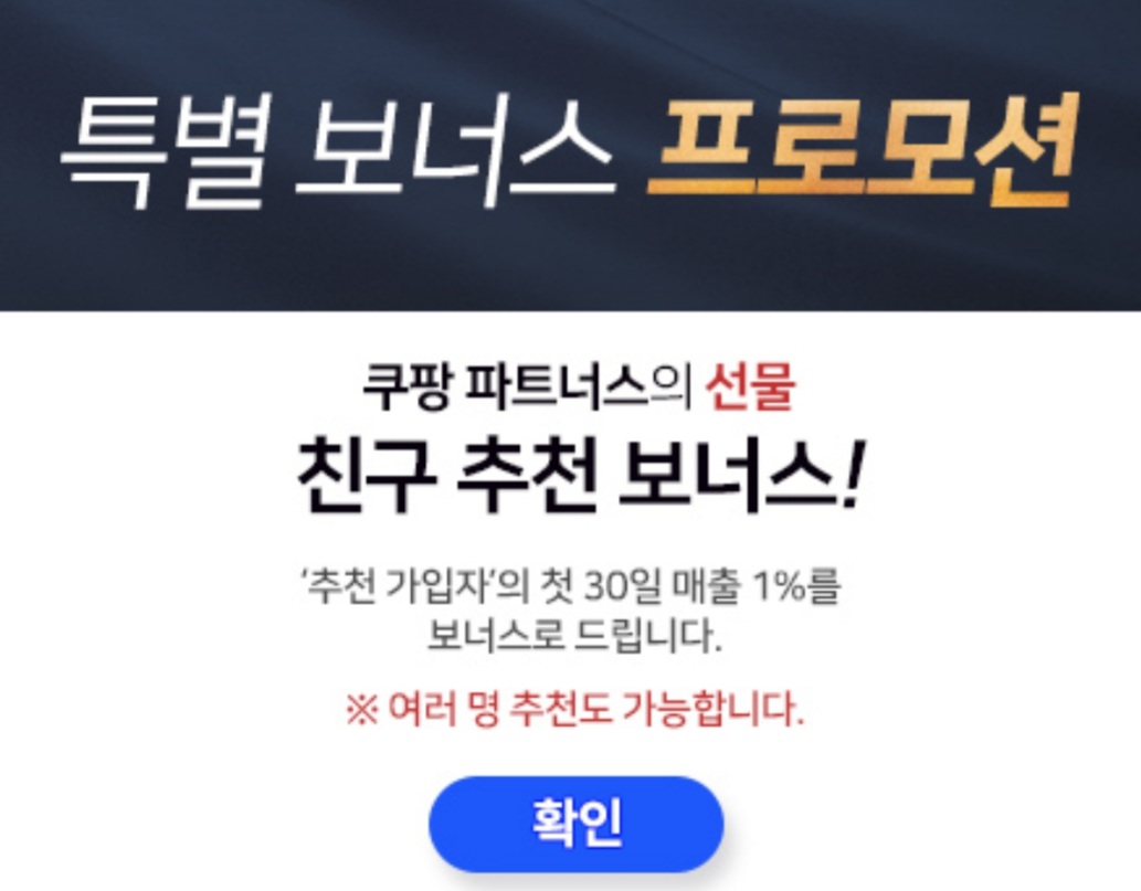 쿠팡 파트너스 가입 시 추천인 기재하시면 한달동안 구매금액의 기본 3% + 한 달 동안 추가 1% 받을수 있습니다.