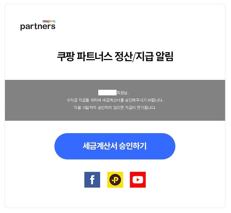 법인/개인사업자(세금계산서Y)는 실적 확정 이후 쿠팡에서 역발행하는 세금계산서를 확인하신 후 기간내에 승인 후 지급되며, 사업자의 경우 기간 내 세금계산서 승인을 하지 못한 경우, 해당 수익금은 익월로 누계되어 처리됩니다.