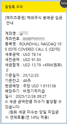 오늘은 제가 모아가고 있는 QDTE (Roundhill NASDAQ-100 0DTE Covered Call Strategy ETF) 의 배당금 입금 알림이 와서 기록용으로 남겨봅니다.